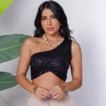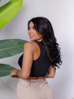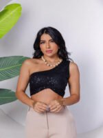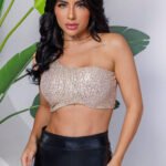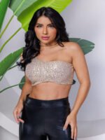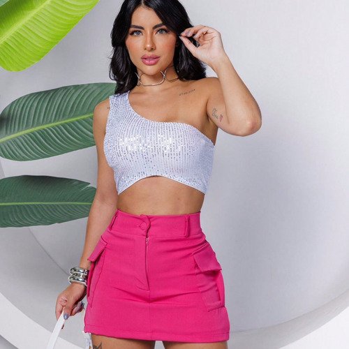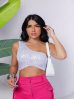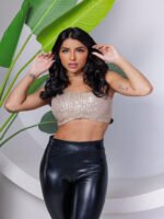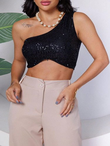 Top Cropped Feminino Lantejoulas Alça Fina Poliéster Casual